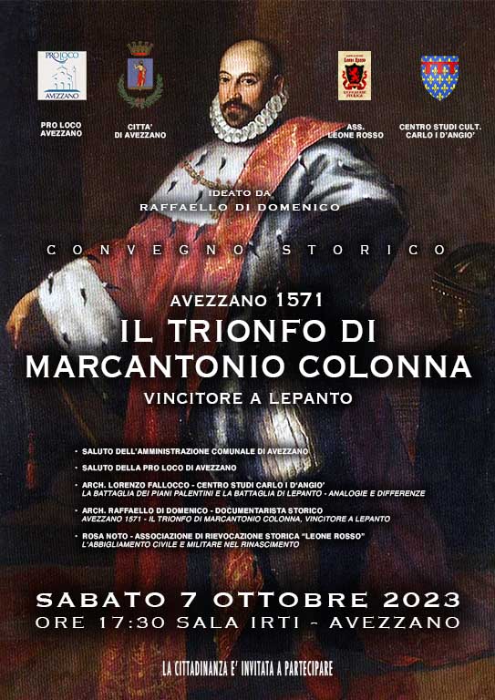 Sabato 7 ottobre 2023 avrà luogo ad Avezzano l'evento organizzato da Raffaello Di Domenico su Lepanto e il Trionfo di Marcantonio Colonna in Avezzano nel 1571. Sospeso a causa del COVID, il convegno annuale dedicato alla vittoria di Marcantonio Colonna a Lepanto, riprenderà quest'anno con importanti ospiti culturali e con gli abiti della sarta storica […]